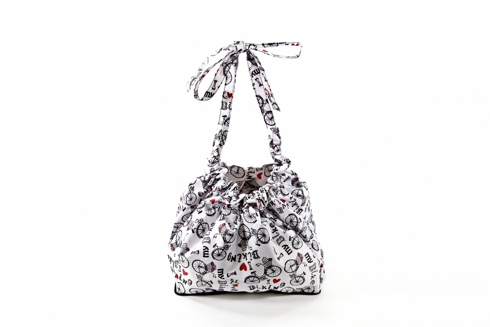 This awesome I Love My BIKE Bicycle basket liner is the ultimate cruiser bike accessory. This original bike basket liner is all weather friendly, reversible and crafted in nylon rip-stop material with durable sturdy draw straps to convert easily into a generously sized market bag, gym bag, yoga bag, beach bag, tote bag! Featuring two deep pockets (water bottle size) Also folds up easily into a compatible zippered pouch.  Easy to take in and out of bike basket. Designed in Huntington Beach, California. Matching Bicycle seat cover available!