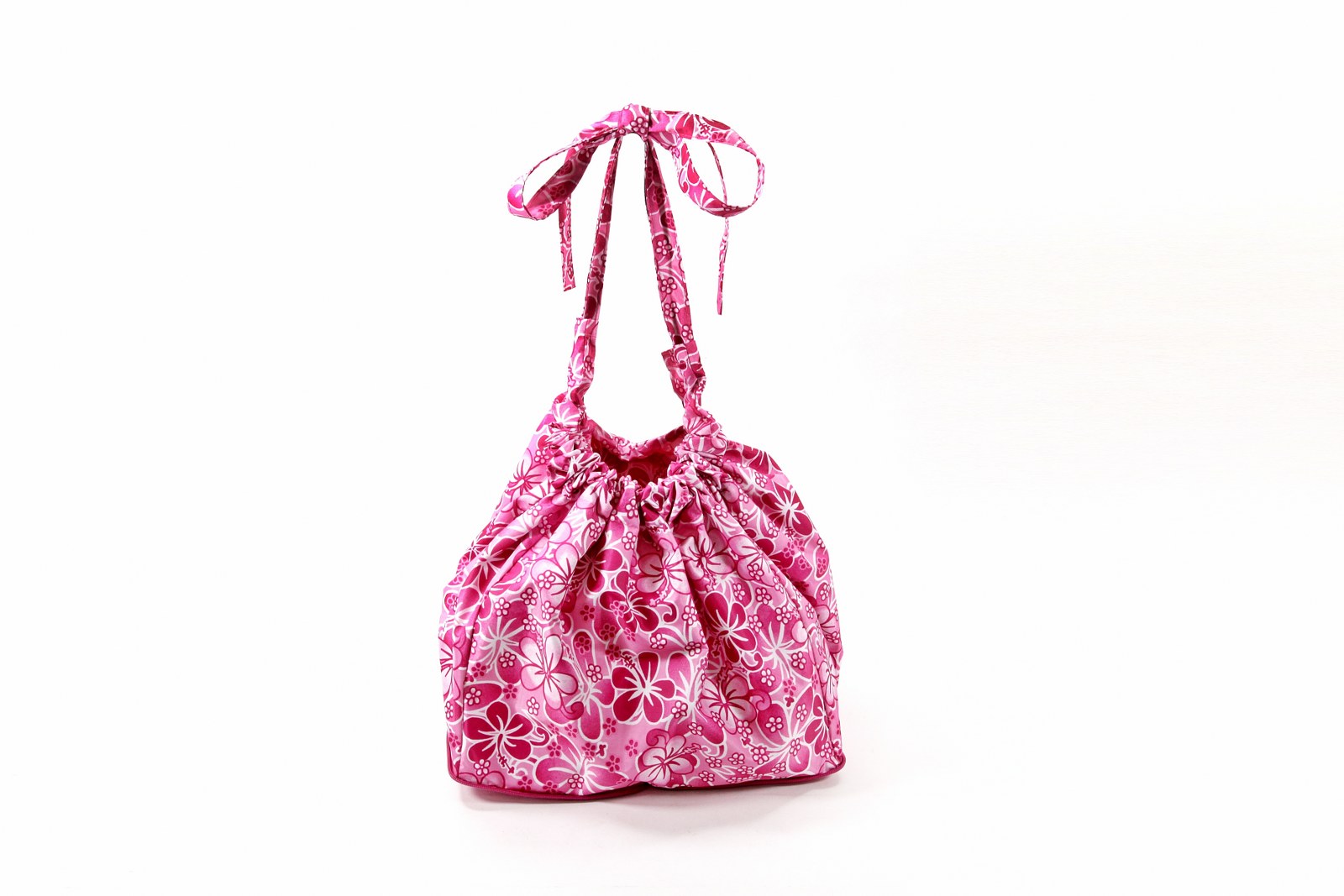 This awesome Pink Hawaiian Bicycle basket liner is the ultimate cruiser bike accessory. This original bike basket liner is all weather friendly, reversible and crafted in nylon rip-stop material with durable sturdy draw straps to convert easily into a generously sized market bag, gym bag, yoga bag, beach bag, tote bag! Featuring two deep pockets (water bottle size) Also folds up easily into a compatible zippered pouch.  Easy to take in and out of bike basket. Designed in Huntington Beach, California.